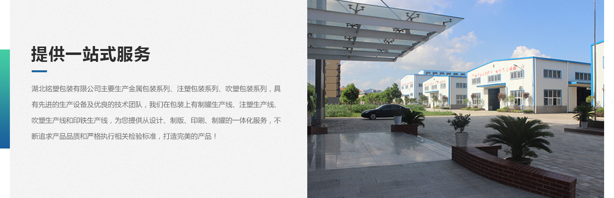 湖北銘塑包裝有限公司一家集研發(fā)、生產(chǎn)、銷售于一體的較優(yōu)秀民營企業(yè),技術(shù)力量雄厚,產(chǎn)品質(zhì)量可靠。位于交通暢順,百業(yè)興旺、經(jīng)濟富裕、政策開放的孝感開發(fā)區(qū)域。我們企業(yè)的營銷戰(zhàn)略是以建筑為土壤,以產(chǎn)品為種子,以質(zhì)量為肥料,讓綠色鋪滿全球。憑借多年來的行業(yè)經(jīng)驗,公司不斷進行創(chuàng)新和研發(fā),為市場提供更廣泛的產(chǎn)品應(yīng)用領(lǐng)域和更好環(huán)保節(jié)能產(chǎn)品,為國家能源環(huán)保戰(zhàn)略和可持續(xù)發(fā)展戰(zhàn)略作出應(yīng)有的貢獻。 湖北銘塑包裝有限公司主要生產(chǎn)金屬包裝系列、注塑包裝系列、吹塑包裝系列,具有先進的生產(chǎn)設(shè)備及優(yōu)良的技術(shù)團隊,我們在包裝上有制罐生產(chǎn)線、注塑生產(chǎn)線、吹塑生產(chǎn)線和印鐵生產(chǎn)線,為您提供從設(shè)計、制版、印刷、制罐的一體化服務(wù),不斷追求產(chǎn)品品質(zhì)和嚴格執(zhí)行相關(guān)檢驗標準,打造更好的產(chǎn)品!